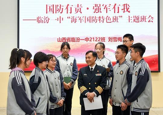圖為臨汾軍分區(qū)大校政治委員劉海洋(右三)為臨汾第一中學(xué)“海軍國(guó)防特色班”學(xué)生講述經(jīng)典戰(zhàn)例。李旭峰 攝