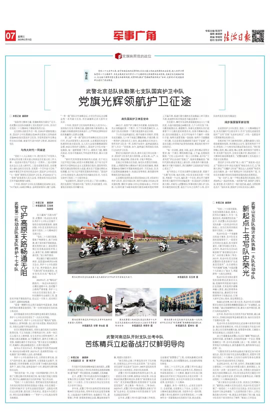 黨的二十大召開以來,駐守祖國各地的武警部隊官兵以最大的政治熱情和政治自覺,投入到學(xué)習(xí)貫徹黨的二十大精神中。為充分展現(xiàn)官兵們學(xué)習(xí)二十大精神的火熱場景和生動實踐,反映官兵忠誠維護(hù)核心、矢志奮斗強(qiáng)軍的堅定意志和嶄新風(fēng)貌,武警部隊推出“黨旗映照我的戰(zhàn)位”活動,記者對4個先進(jìn)基層單位進(jìn)行了采訪報道。