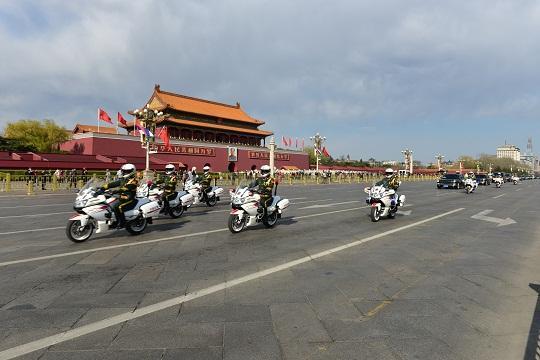 圖為武警北京總隊執(zhí)勤第七支隊國賓護(hù)衛(wèi)中隊護(hù)衛(wèi)外賓駛過天安門。 本報通訊員 石玉濤 攝