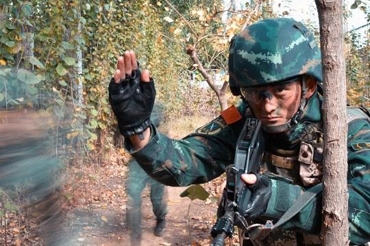 圖為武警山東總隊臨沂支隊執(zhí)勤一大隊機(jī)動中隊官兵在“時代楷?!睆堥裣袂爸販仃犛?xùn)。本報通訊員 翟樹衫 攝