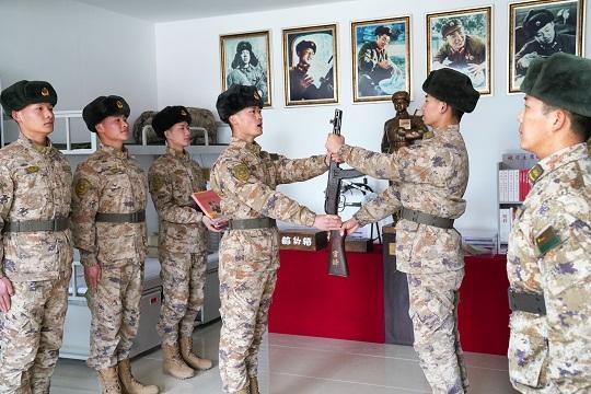 圖為第79集團(tuán)軍某旅“雷鋒班”班長(zhǎng)牟振華(左四)將“雷鋒槍”交接給新入班戰(zhàn)士蔣佳恒(右二)。 張永進(jìn) 攝