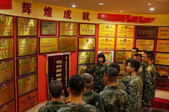 圖為武警陜西總隊(duì)漢中支隊(duì)勤務(wù)保障大隊(duì)副大隊(duì)長(zhǎng)劉蕾在支隊(duì)史館為下隊(duì)新兵講述支隊(duì)建設(shè)發(fā)展歷程。李淼 攝
