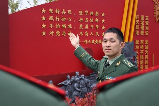 圖為武警工程大學(xué)學(xué)員萬(wàn)鴻玥在武警安徽總隊(duì)合肥支隊(duì)史館父親萬(wàn)四海的雕像旁緬懷追思。徐偉 攝