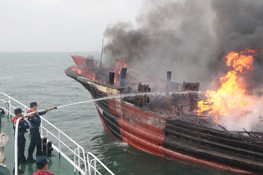 圖為海警執(zhí)法員用高壓水槍滅火。