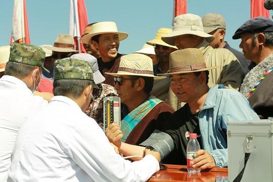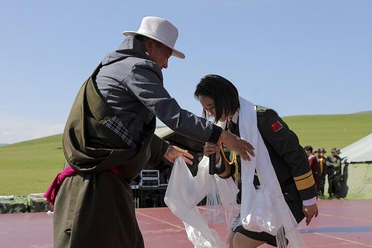 圖為藏族群眾為演員獻(xiàn)哈達(dá)。朱曉坷 攝