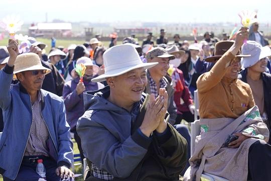 表演唱《和諧家園》、舞蹈《民族舞串燒》、快閃《向幸福出發(fā)》……節(jié)目一個比一個精彩,掌聲也一次比一次熱烈,現(xiàn)場觀眾的興致越來越高,獻(xiàn)哈達(dá)、搖彩旗,臺上臺下熱烈互動,高亢嘹亮的歌聲、威風(fēng)震撼的鑼鼓、歡快熱烈的舞蹈、飄動飛舞的彩旗,使原本寂靜的金銀灘大草原變成歡樂的海洋。