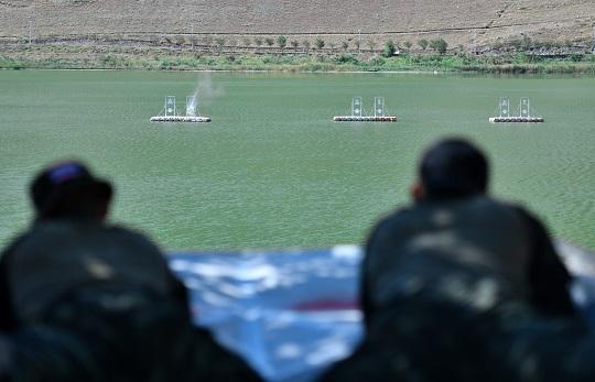 圖為參賽選手進行水上狙擊課目競賽。徐偉 攝