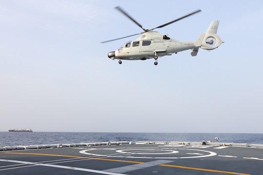 圖為當(dāng)?shù)貢r(shí)間7月26日下午,編隊(duì)指揮艦淄博艦艦載直升機(jī)起飛,遠(yuǎn)處為航行中的“海瀾之韻”號(hào)商船。孫飛 攝