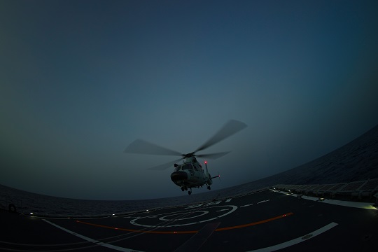 圖為當(dāng)?shù)貢r(shí)間7月26日晚上,編隊(duì)指揮艦淄博艦艦載直升機(jī)完成警戒巡邏后任務(wù)后進(jìn)行夜間著艦。孫飛 攝