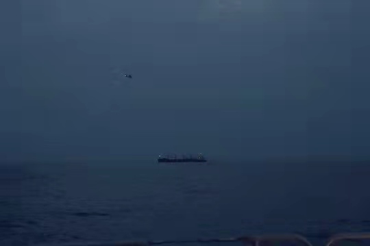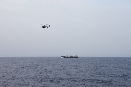 圖為當(dāng)?shù)貢r(shí)間7月26日下午,編隊(duì)指揮艦淄博艦艦載直升機(jī)正在“海瀾之韻”號(hào)商船附近??沼蚓溲策墶O飛 攝