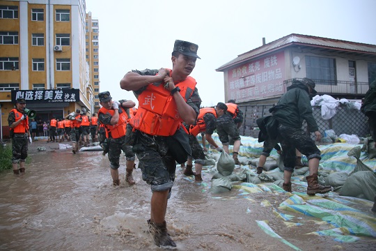 8月4日0時(shí)20分,武警黑龍江總隊(duì)哈爾濱支隊(duì)200余名官兵緊急馳援,連夜奮戰(zhàn)9小時(shí),在螞蟻河周邊壘筑沙袋2.8萬余個(gè),筑起1.3米高阻隔沙墻600余延長米,保證了當(dāng)?shù)厝嗣袢罕娚?cái)產(chǎn)安全。