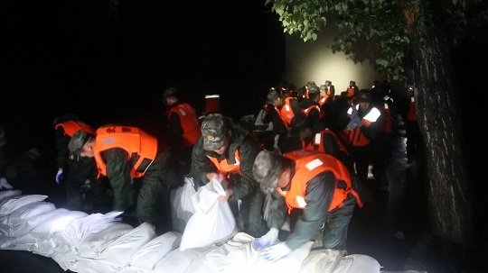 5日凌晨1時20分,官兵們到達現場后迅速展開戰(zhàn)斗,每5人為一個小組,分別負責沙袋填充、搬運和鋪設等工作。官兵克服困難,在黑夜中連續(xù)奮戰(zhàn)4小時,在鏡泊湖水庫周邊壘筑沙袋近千余個,筑起0.6米高阻隔沙袋200余米。保證了駐地群眾生命財產安全。