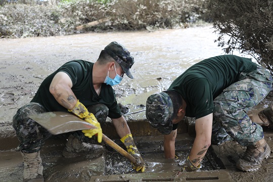 在受災地區(qū),橋梁盡數沖毀、道路塌方嚴重,一路上不時有落石從山上滾下。連續(xù)多天的任務,讓官兵疲憊不堪,高溫、暴雨,都在考驗著任務官兵。