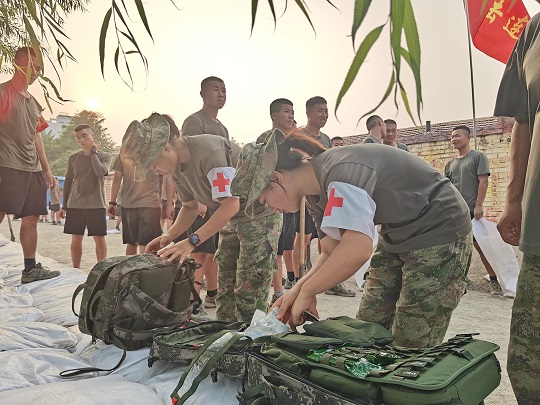 正午時(shí)分,天氣悶熱。連續(xù)奮戰(zhàn)近8個(gè)小時(shí),“模范衛(wèi)生隊(duì)”特診技師、二級上士趙鑫的衣服干了又濕,臉頰和胳膊曬得通紅。除了擔(dān)負(fù)全旅的衛(wèi)勤保障任務(wù),趙鑫和連隊(duì)其余9名女兵主動請戰(zhàn):挺在一線,裝沙筑堤?!澳斜芨傻奈覀兌寄芨伞!壁w鑫說。