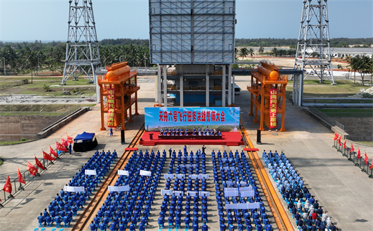 在文昌航天發(fā)射場,每次發(fā)射前都有一項特殊的“出征儀式”——火箭垂直轉(zhuǎn)運。航天人深情凝望火箭活動發(fā)射平臺上的鮮紅國旗和動員標語,揮舞黨旗、唱響紅歌、誓師動員……這項特殊的儀式,見證著祖國航天事業(yè)的騰飛,也為重大航天發(fā)射任務(wù)注入不竭的精神動力。