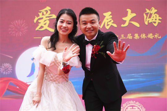 舞臺(tái)、氣球精心裝扮,美景、佳人喜迎幸?!槎Y現(xiàn)場(chǎng),新郎們身著深色西裝,筆挺英?。恍履飩兩泶嵃谆榧?,美麗動(dòng)人。一個(gè)個(gè)精心設(shè)置的儀式,一張張洋溢幸福的笑臉,讓這場(chǎng)集體婚禮甜蜜加倍、幸福爆表。