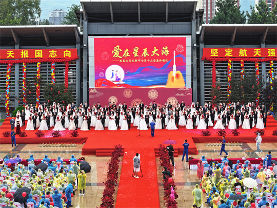 “星辰大海,夢(mèng)想自有夢(mèng)想的力量,仰望在銀河的想象,我們起航……”活動(dòng)最后,全體新人與觀禮人員共同合唱《星辰大海》。愛(ài)在星辰大海,新人們把愛(ài)的誓言唱響在航天大院,幸福的歌聲在青山之間久久回蕩……