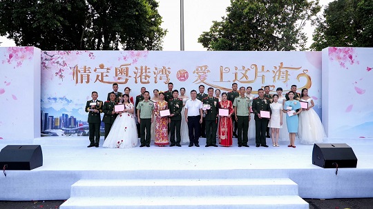“愛(ài)意翻山渡海,終抵良人身畔。今天我們?cè)诖耍吞炜?,和海疆,和艦艇一起?jiàn)證這11對(duì)新人人生最重要的時(shí)刻?!彪S著愛(ài)情的煙花在天空綻放,幸福的汽笛在海疆長(zhǎng)鳴,熱烈的鑼鼓在廊道敲響,11對(duì)新人在親友和來(lái)賓的祝福中從海警艦艇緩步走向“情定粵港灣·愛(ài)上這片?!奔w婚禮的舞臺(tái)。