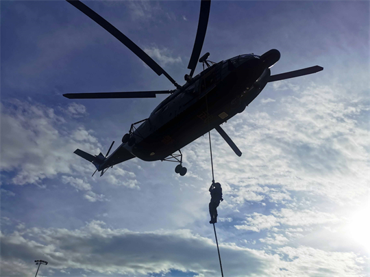 圖為在實(shí)戰(zhàn)化演練中,武警第二機(jī)動(dòng)總隊(duì)某支隊(duì)五中隊(duì)官兵從直升機(jī)上快速索降。楊延國(guó) 攝
