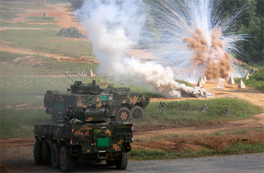 圖為第74集團(tuán)軍某旅“生死在一起連”在實(shí)兵戰(zhàn)術(shù)演練中,裝甲車(chē)快速通過(guò)通路。