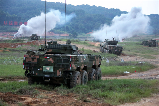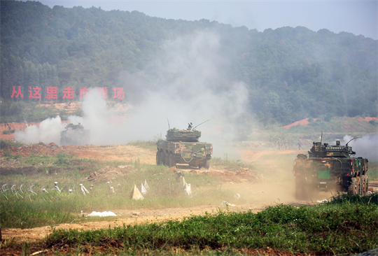 圖為第74集團(tuán)軍某旅“生死在一起連”開(kāi)展實(shí)兵戰(zhàn)術(shù)演練,連隊(duì)?wèi)?zhàn)車(chē)占領(lǐng)前沿陣地。