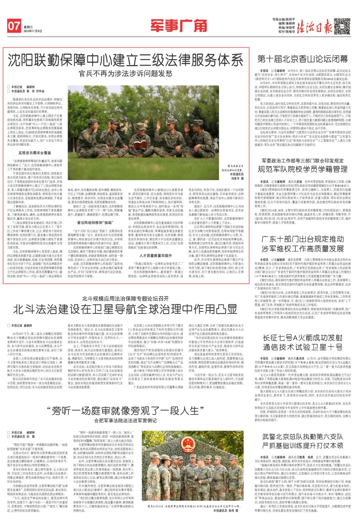 為此,沈陽(yáng)聯(lián)勤保障中心建立固定片區(qū)集成統(tǒng)抓機(jī)制,將所屬單位按照不同地域和類(lèi)型合理劃分,分片構(gòu)建“中心—片區(qū)—基層”三級(jí)法律服務(wù)體系,在統(tǒng)籌軍地法律服務(wù)資源基礎(chǔ)上再投入資金,引進(jìn)8家優(yōu)質(zhì)律師事務(wù)所加強(qiáng)服務(wù)力量,提供網(wǎng)絡(luò)化、開(kāi)放式服務(wù),實(shí)現(xiàn)法律服務(wù)全覆蓋,受益官兵超萬(wàn)人,使廣大官兵不再為涉法涉訴問(wèn)題發(fā)愁。