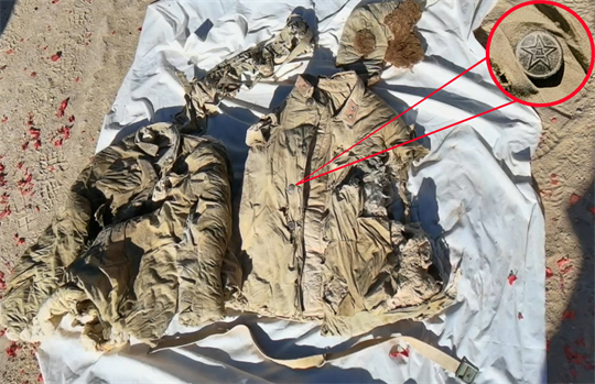 專業(yè)人員在對遺骸一帶進(jìn)行深度勘查挖掘時,又發(fā)現(xiàn)一些子彈袋、老式解放鞋、軍衣軍帽等舊式軍用品和部分散落骸骨。其中,兩具遺骸較為完整,部分衣扣上鑄有清晰的“八一”字樣,衣領(lǐng)上還有紅色領(lǐng)章,一條破碎的舊毛巾上印有依稀可見的“軍用品”三個字。