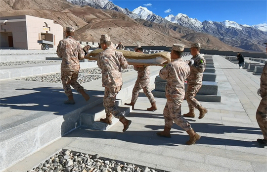 近日,新疆維吾爾自治區(qū)軍地檢察機(jī)關(guān)和退役軍人事務(wù)部門相關(guān)人員來到康西瓦烈士陵園,共同迎接“失散”多年的英烈遺骸“歸隊”,8名邊防官兵邁著穩(wěn)重的步伐,輕輕將遺骸放入墓穴中。
