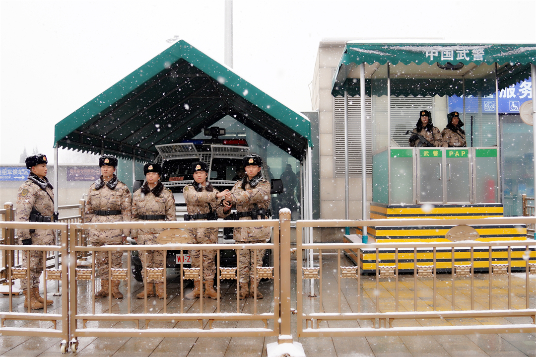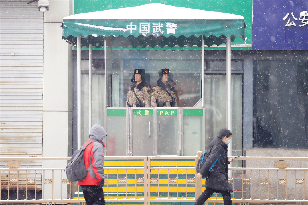 盡管降雪比較大,北京西站南北廣場(chǎng)、豐臺(tái)站仍然有不少旅客冒雪出行。武警官兵堅(jiān)守在執(zhí)勤崗位,時(shí)刻觀察著周邊情況,積極熱情為旅客提供幫助,確保大家安全有序出行。