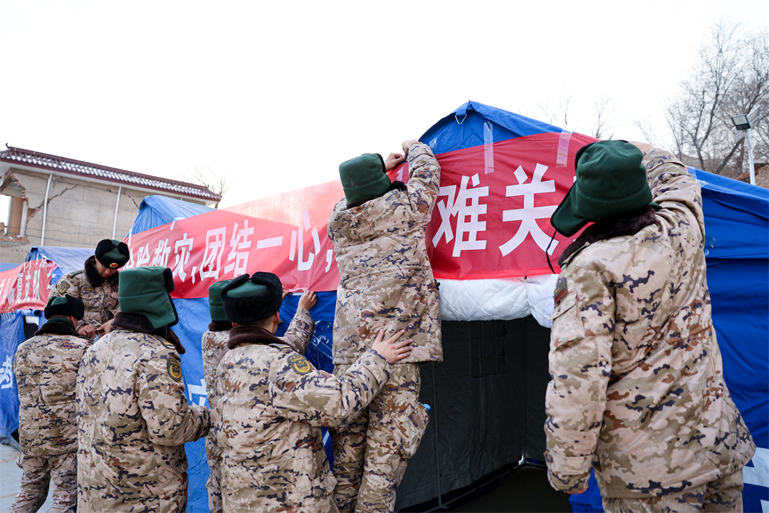 積石山6.2級地震發(fā)生后,武警甘肅總隊迅速啟動應(yīng)急響應(yīng)機制,第一時間展開抗震救災(zāi)工作。廣大官兵不畏嚴寒、不懼艱險,發(fā)揚連續(xù)奮戰(zhàn)精神,迅速趕到震中區(qū)域投入搜救被困人員,搶修道路、搬運物資、搭建帳篷等任務(wù)。