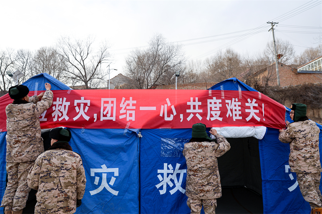 圖為12月19日,武警甘肅總隊臨夏支隊官兵正在搭建帳篷,張貼橫幅。
