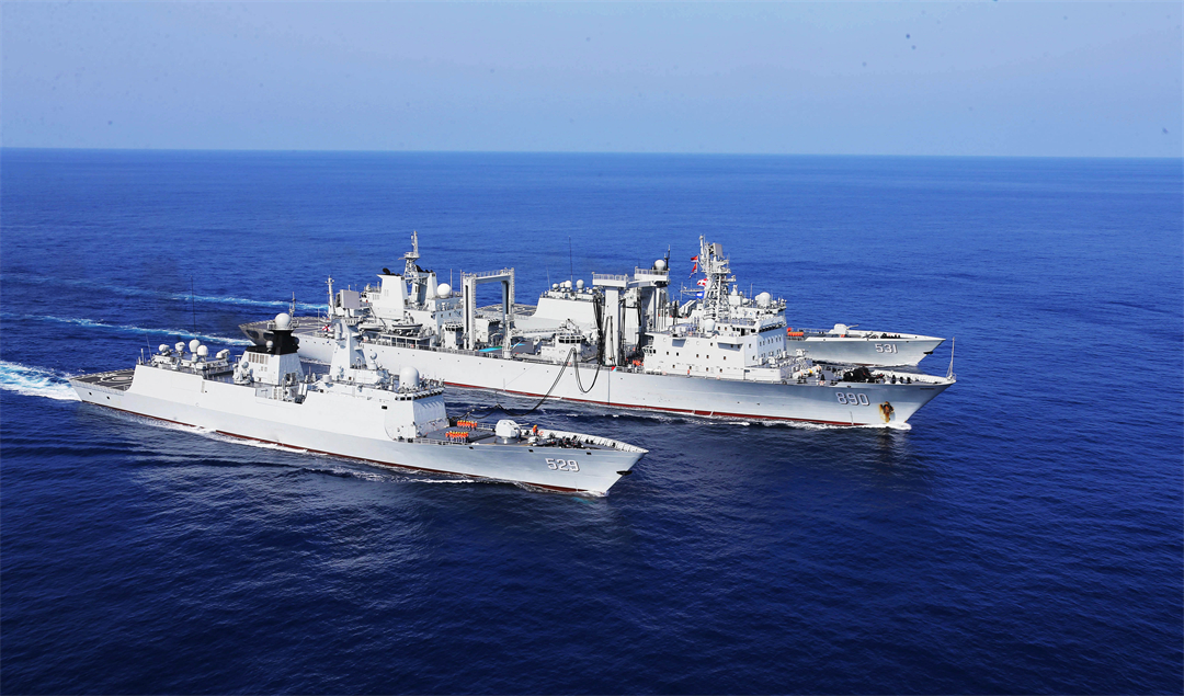 圖為2016年4月25日,第23批護(hù)航編隊(duì)正在進(jìn)行航行補(bǔ)給。錢宏 攝