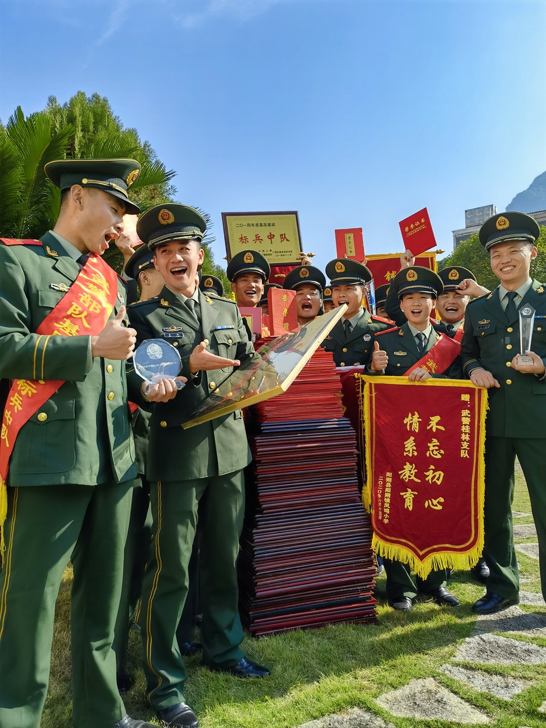 圖為武警陽朔中隊官兵與歷年獲得的榮譽獎牌合影。