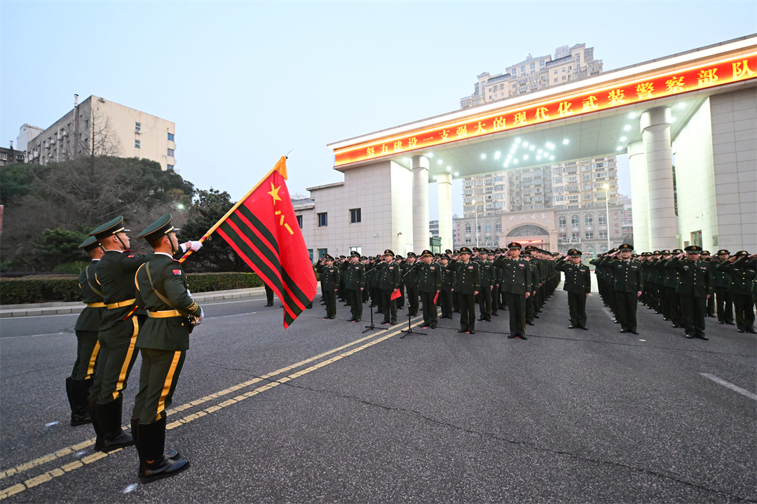 圖為武警江西總隊(duì)在機(jī)關(guān)營(yíng)區(qū)舉行“升國(guó)旗、迎戰(zhàn)旗、學(xué)訓(xùn)詞”活動(dòng)。何宗卯 許書燦 攝