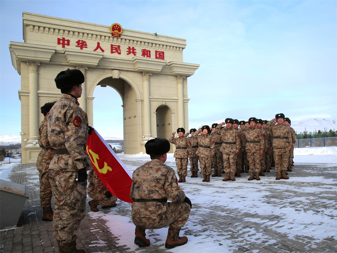 在祖國北疆的國門前,全體人員面向黨旗莊嚴宣誓。大家緊握的拳頭堅定有力,鏗鏘的誓言響徹云霄,表達著對黨忠誠的堅定信仰和為國防事業(yè)不懈奮斗的決心。