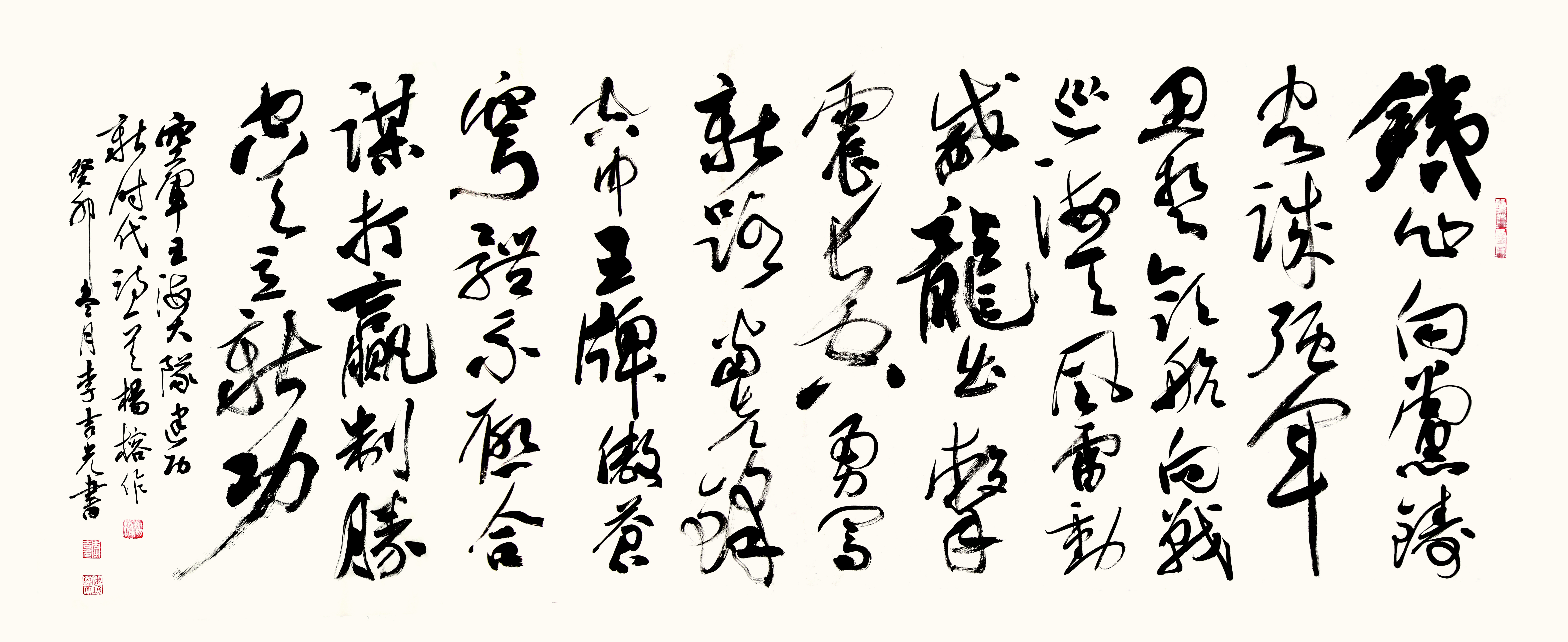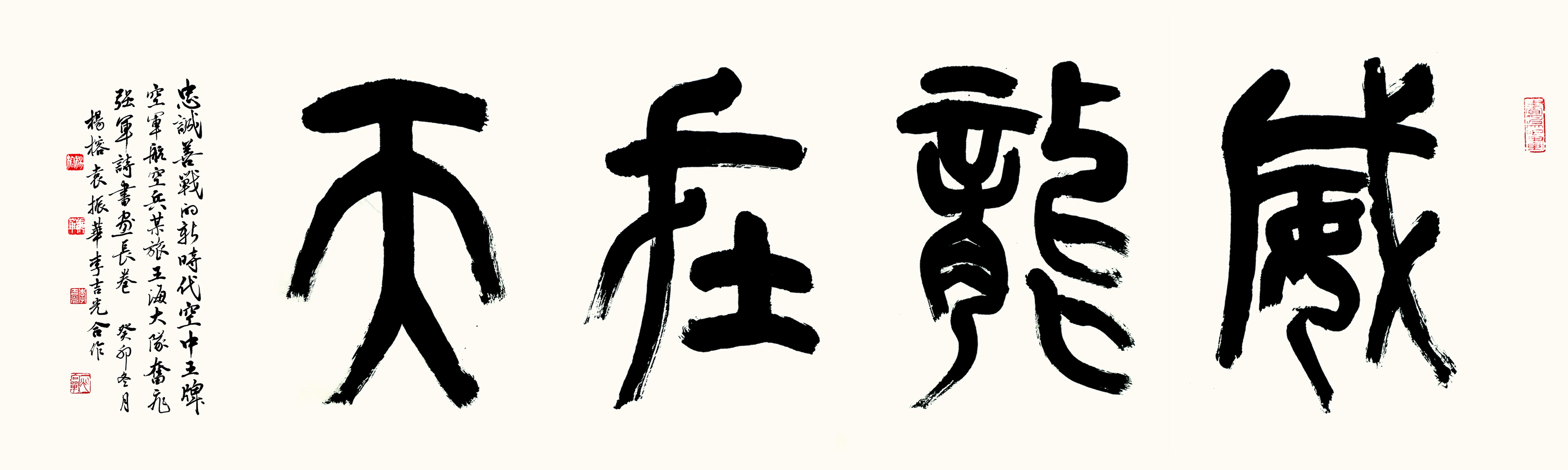 《威龍?jiān)谔臁吩?shī)書畫長(zhǎng)卷,以中國(guó)傳統(tǒng)文化中的詩(shī)詞、書法和繪畫的藝術(shù)形式,通過傳統(tǒng)筆墨全景式展現(xiàn)70多年來“王海大隊(duì)”的“聞戰(zhàn)則喜,英勇頑強(qiáng),敢打必勝,有我無敵”的精神傳承和價(jià)值追求。英雄傳人亦英雄,新時(shí)代“王海大隊(duì)”昂首闊步,敢闖新路,當(dāng)先鋒打頭陣,奮力譜寫強(qiáng)軍興軍新征程的時(shí)代篇章,奮飛一流、制勝空天的鮮活畫卷。