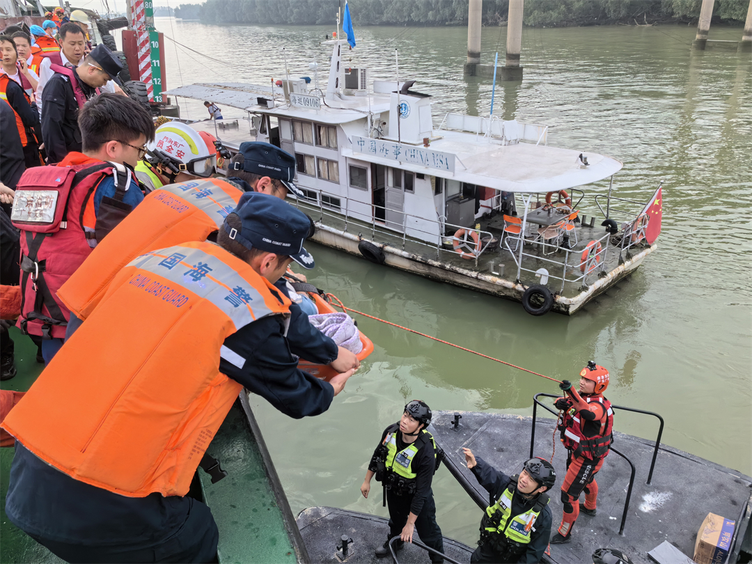2月22日6時許,廣州海警局接報警,南沙瀝心沙大橋被撞,橋體斷裂,橋上有車輛落水,情況危急請求救援。接警后,廣州海警局立即啟動海上應(yīng)急救援預(yù)案,指派21523、21141等執(zhí)法艇第一時間到達事發(fā)海域,聯(lián)合消防、公安、海事等單位開展緊急救援。