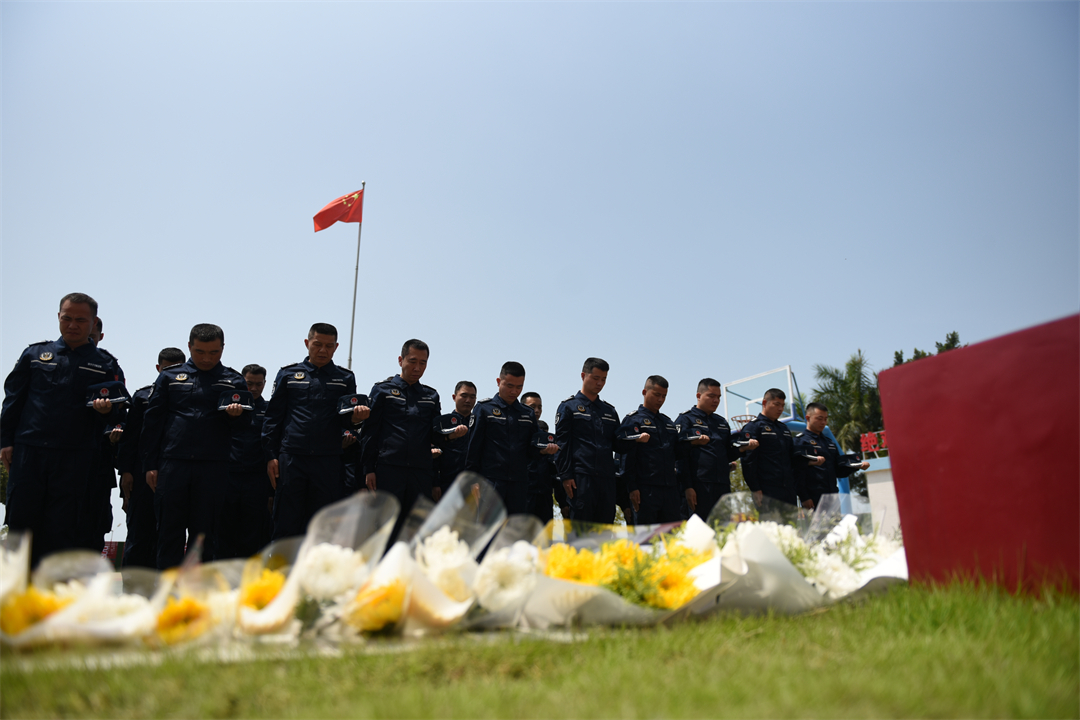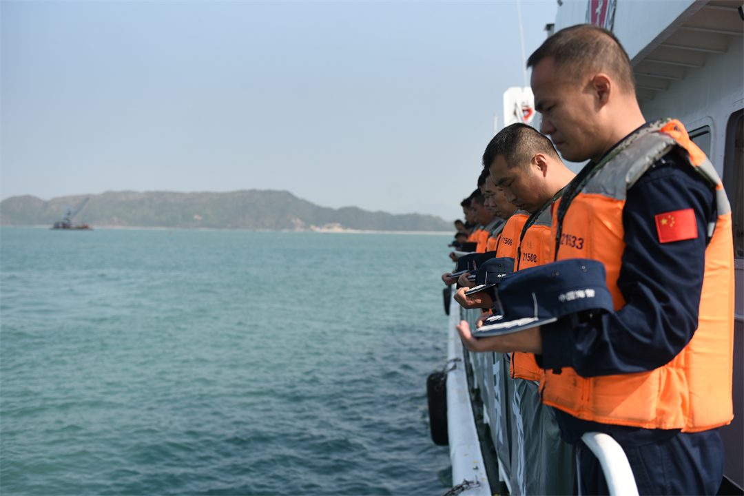 “全體都有!脫帽,默哀。”伴隨著現(xiàn)場(chǎng)指揮員下達(dá)口令,船艇汽笛長(zhǎng)鳴、響徹海天,全體人員整齊列隊(duì)、脫帽肅立。