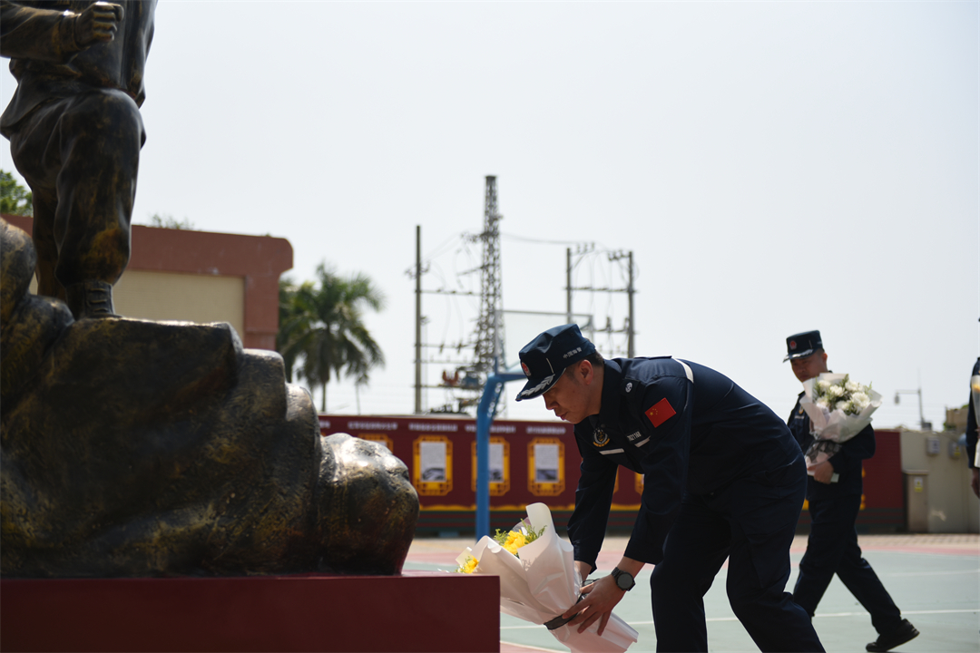 圖為海警執(zhí)法員在汪曉龍雕像前敬獻(xiàn)鮮花。