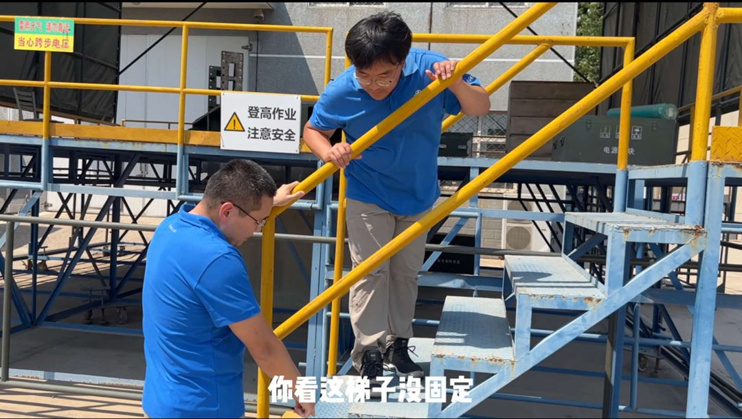 “這個(gè)梯子沒(méi)固定,上下平臺(tái)很容易摔倒。”視頻中,小翟叫住正準(zhǔn)備登上平臺(tái)的小劉,并帶著他一起將四個(gè)輪子鎖緊。這是在調(diào)試平臺(tái)測(cè)試時(shí)容易被忽略的一處隱患,視頻通過(guò)糾錯(cuò)的方式,講解登高作業(yè)的操作規(guī)范,讓大家更容易入腦入心。