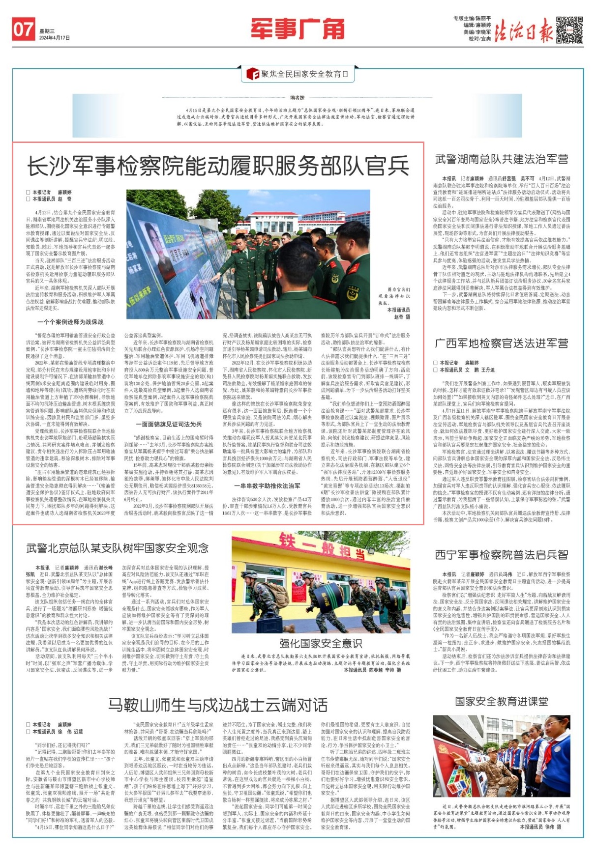 4月15日是第九個(gè)全民國(guó)家安全教育日,今年的活動(dòng)主題為“總體國(guó)家安全觀·創(chuàng)新引領(lǐng)10周年”。連日來,軍地聯(lián)合通過戍邊戰(zhàn)士云端對(duì)話、武警官兵進(jìn)校園等多種形式,廣泛開展國(guó)家安全法律法規(guī)宣講活動(dòng)。軍地法官、檢察官通過理論講解、以案說法、互動(dòng)問答等送法進(jìn)軍營(yíng),營(yíng)造依法維護(hù)國(guó)家安全的濃厚氛圍。