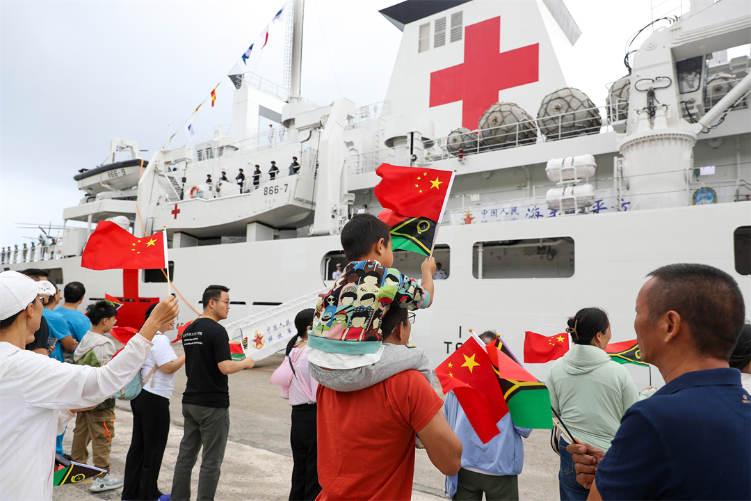 圖為海軍和平方舟醫(yī)院船抵達(dá)瓦努阿圖,當(dāng)?shù)孛癖姛崃覛g迎”和平方舟“的到來。黎宇 攝