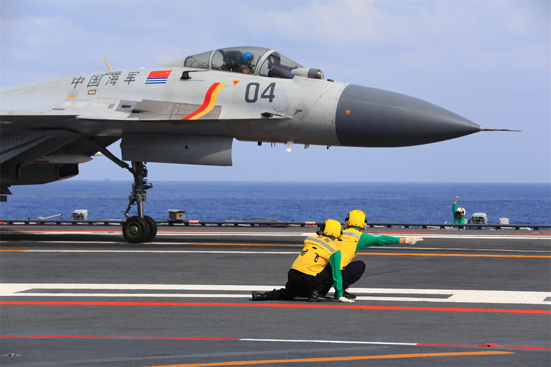 圖為遼寧艦起飛助理作出放飛手勢,殲-15艦載戰(zhàn)斗機起飛。張凱 攝