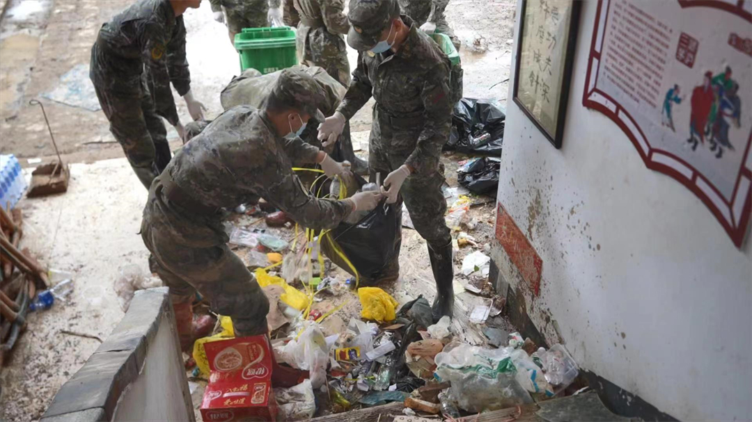 河邊的公路坍塌了近50米,官兵只能繞道山林中繼續(xù)前行,步行2分鐘就能通過的路程,卻因道路塌方繞行了10分鐘。只見被洪水淹過的房屋一樓已被覆蓋了一層近10厘米的淤泥,門口“好日子天天開心,美生活年年如意”橫幅被暴雨沖刷得破爛不堪,正在清掃淤泥的村民看見武警官兵顯得很興奮:“你們來(lái)了,我們懸著的心就放下來(lái)了,我相信日子會(huì)越來(lái)越好。”
