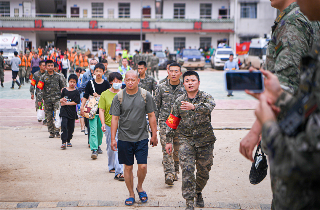 “把群眾都安全轉(zhuǎn)移了,我們就撤離?!?4日17時(shí)30分,楊忠支隊(duì)長說,“不僅要確保群眾生命安全,還要把每一名戰(zhàn)友安全帶回去。”夜幕降臨,暴雨傾盆而下,轉(zhuǎn)運(yùn)完群眾的官兵猶如一條火龍向著韶關(guān)市區(qū)的方向前行。