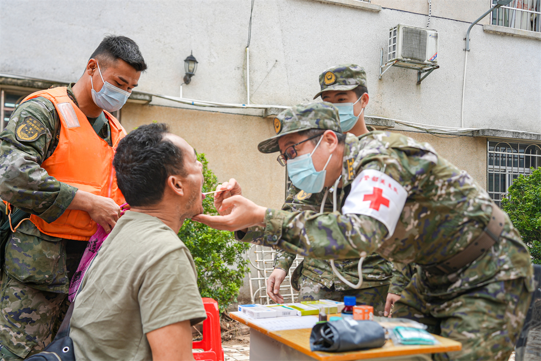 圖為武警廣東總隊(duì)韶關(guān)支隊(duì)衛(wèi)生隊(duì)在撤離前為受難群眾及全體官兵做健康檢查服務(wù)。