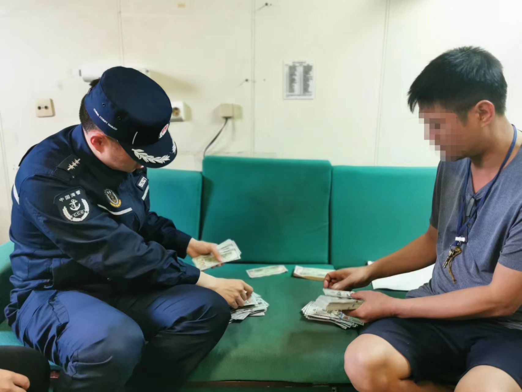 圖為執(zhí)法員對違法所得的美金紙幣進(jìn)行清點(diǎn)。