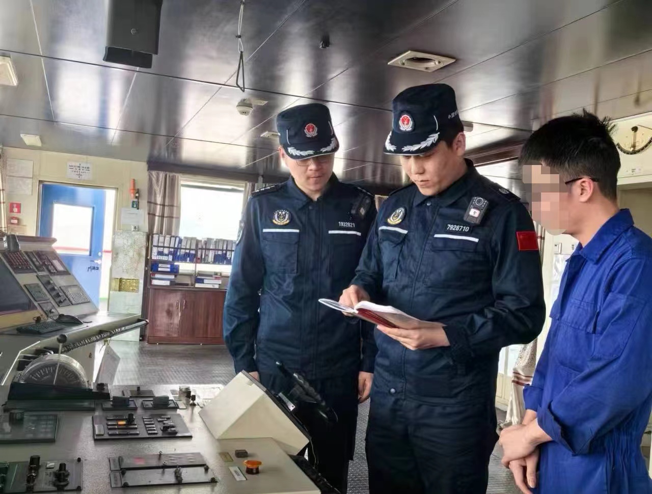 圖為執(zhí)法員對外籍貨輪進(jìn)行現(xiàn)場檢查。
