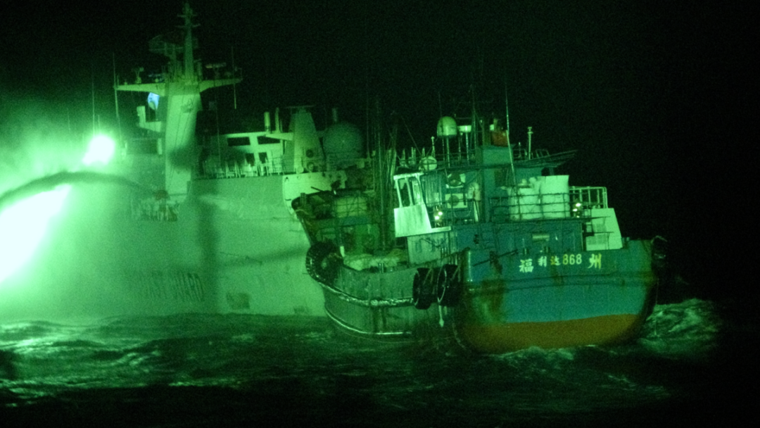 圖為2023年2月2日,中國海警局直屬第三局四方艦正在對(duì)“2022-363”海上特大毒品案的涉案船只進(jìn)行水炮噴射,強(qiáng)行逼停目標(biāo)船只。