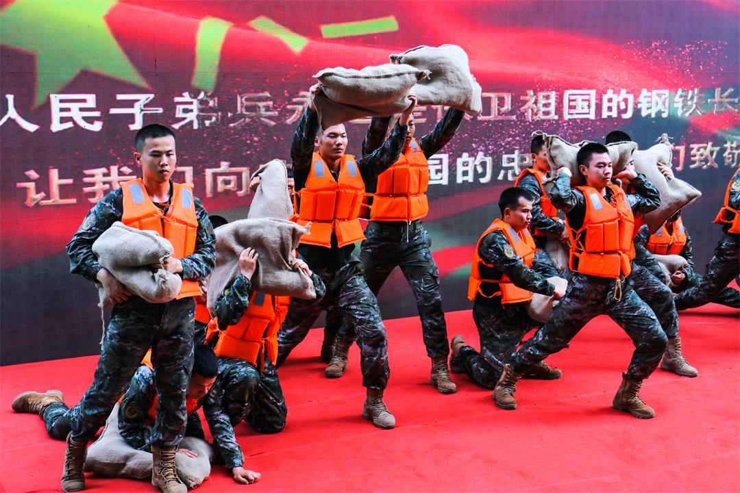 《擒敵術(shù)》表演拉開演出序幕,官兵們熟練的動(dòng)作、默契的配合點(diǎn)燃全場氣氛。由官兵自導(dǎo)自演的舞蹈《眾志成城》,真實(shí)再現(xiàn)了大家投身抗洪搶險(xiǎn)任務(wù)時(shí)的場景,贏得全場熱烈掌聲。整場演出精彩紛呈,二胡獨(dú)奏、相聲、快板,一個(gè)個(gè)節(jié)目高潮迭起,現(xiàn)場掌聲經(jīng)久不息,展現(xiàn)了“軍愛民、民擁軍,人民軍隊(duì)忠于黨”的永恒主題,給官兵帶來極大精神鼓舞。大家一致表示,一定立足本職崗位,苦練軍事技能,發(fā)揚(yáng)優(yōu)良傳統(tǒng),圓滿完成各項(xiàng)任務(wù),為推動(dòng)軍民融合高質(zhì)量發(fā)展作出自己的貢獻(xiàn)。演出在合唱《團(tuán)結(jié)就是力量》的歌聲中落下帷幕。